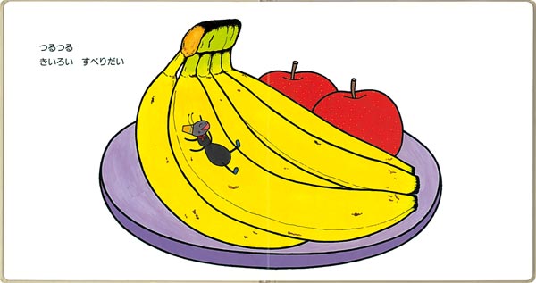台所で小さなありが、おいしそうなものを目がけてテーブルにやってきます。いいにおいのバナナの滑り台で遊び、ビスケットや煎餅をつまみ食い。そして、しゅうしゅうと音のする方へ近づいて、触ってみますが……「あっちっちー」。しゅうしゅうしているものは、やかんに入ってるお湯の蒸気でした。ありの目線で描かれた絵や好奇心いっぱいのありに子どもたちが引き込まれます。