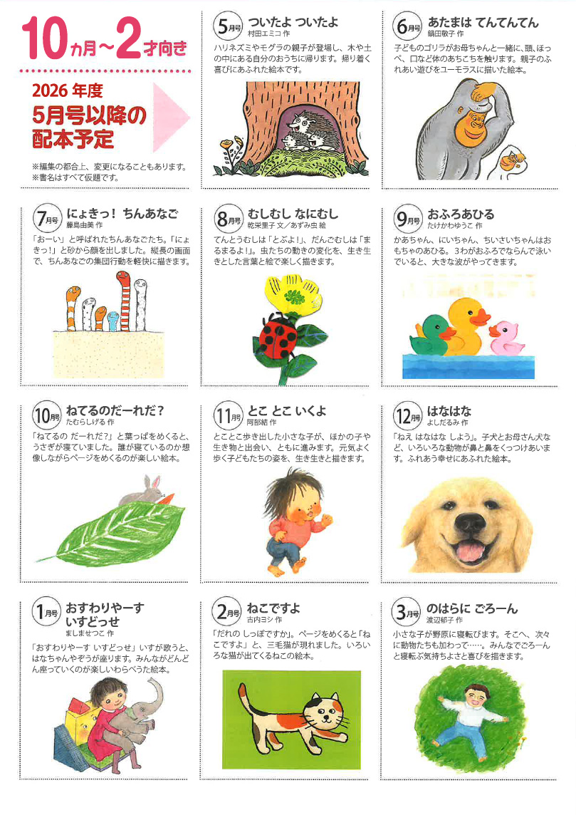 限られた「ことば」「生活」「体験」の中で生きている赤ちゃん。でも、10ヵ月を過ぎるころになると絵本を十分楽しめるようになります。「こどものとも0.1.2.」は、赤ちゃんとお母さんお父さんとの豊かなふれあいの時間を作る絵本です。親子の心のつながりと喜びが生まれる12冊をお届けします。