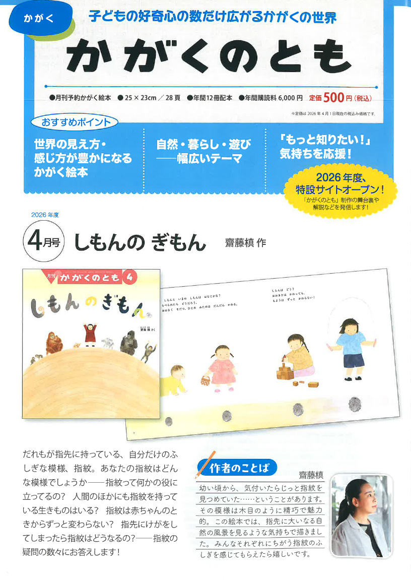 子どもたちの身の回りのことすべてが「かがくのとも」のテーマ。身近な植物、動物、モノ、現象を、事実の羅列ではなくストーリー性を大切にして、子どもたちに伝えます。自然、人間と生活、遊びの3つの視点から、子どもたちの発見の喜びや驚きを応援します。